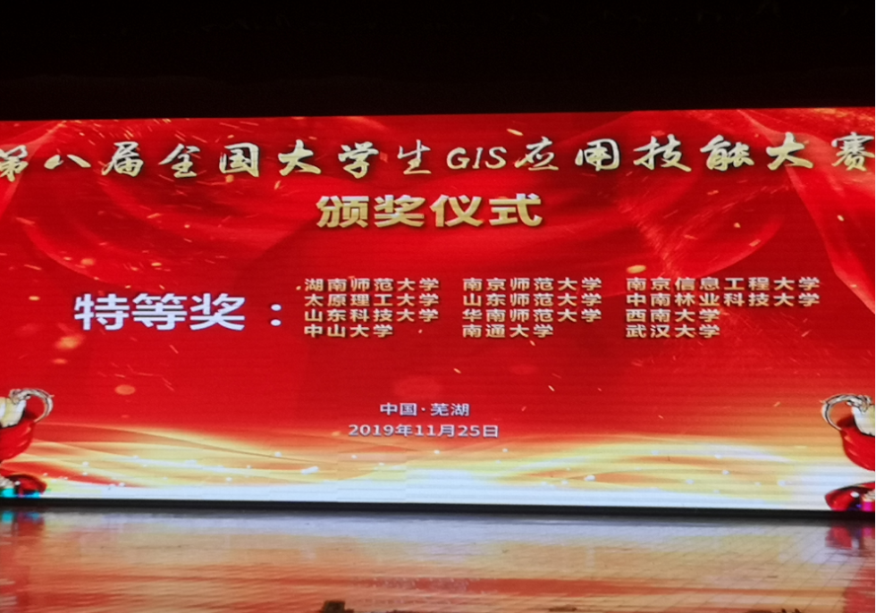 2019年11月23日至25日,第八届全国大学生GIS应用技能大赛暨地理学科及一流专业建设高峰论坛在安徽师范大学成功举办。由beat365官网胡宇宸、马培龙、高丽娜、汤中港等四位同学组成的参赛团队喜获大赛特等奖,陶菲、周侗老师喜获优秀指导教师特等奖,取得了我校参赛以来的最好成绩。