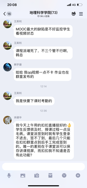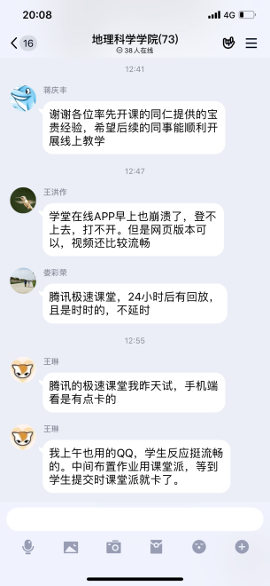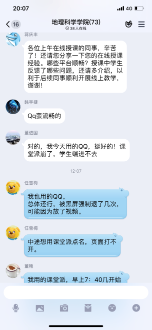 截止下午4:50时,beat365官网共线上开课11门,当日共有18位教师近500名学生参与在线教学与学习。分管教学的蒋庆丰副院长表示,感谢今天第一批线上授课的同事分享经验和建议,希望后续的同事继续努力,严格按课表时间上下课,务必做好“网络拥堵、卡、掉”等应急方案,多渠道保障授课正常进行,实做到教师教学“不掉线”,学生学习“不掉队”。