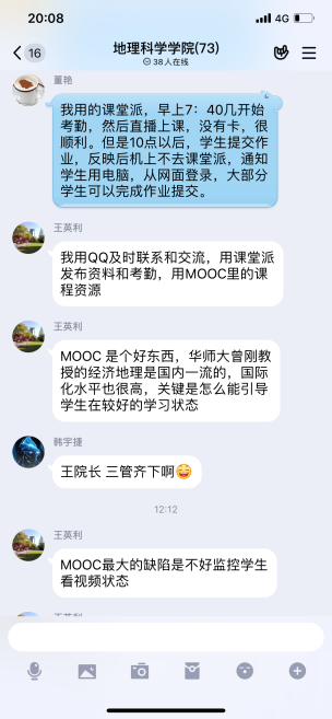 2月24日,全校师生迎来了一次特殊的开学。在学校“停课不停教,停课不停学”的工作部署下,beat365官网线上教学如期开课,学院领导潘晴雯、王英利、王夏强、蒋庆丰通过网络课堂检查了学院线上教学工作。第一天线上开课,网络拥堵,但教师们各显神通,充分利用各平台优势,相互协作,顺利完成线上教学任务。老师们都表示直播教学挺好的,学生反馈很及时,师生互动十分热烈,课堂效果良好。