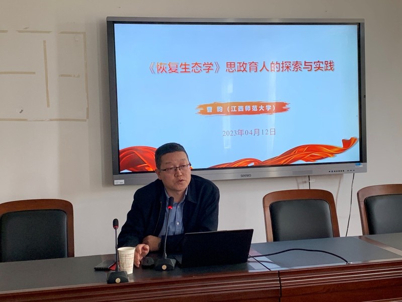 4月12日下午,江西师范大学曹昀教授做客beat365英国官方网站,做了题为“《恢复生态学》思政育人的探索与实践”的专题讲座。讲座由学院副院长蒋庆丰主持,副院长刘波以及学院部分专任教师聆听了讲座。