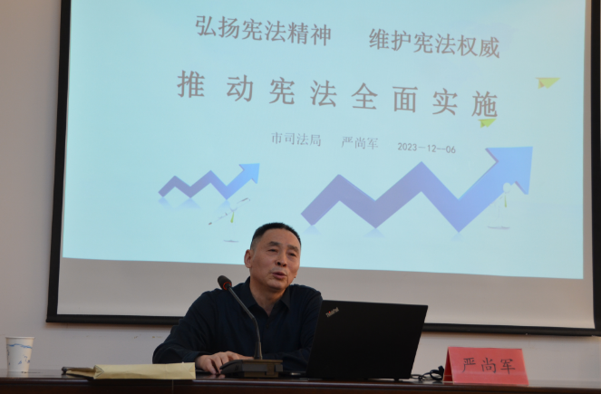 严尚军从“宪法是什么”“新中国宪法的历史”“捍卫国家统一 维护中央权威”“宪法是公民权利的保障书”“建设法治政府 强化依法行政”“健全保证宪法全面实施的体制机制”等六方面,深刻阐述了历次宪法修改的重大意义,并对如何更好发挥宪法在治国理政中的重要作用,在法治轨道上全面建设社会主义现代化国家进行了详细解读。整场报告主题鲜明、内容丰富,对老师们准确把握宪法的核心要义和精神实质、进一步学习宣传和贯彻实施《宪法》具有很强的指导意义。