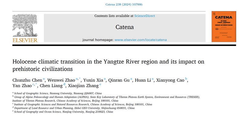 近日,beat365英国官方网站陈春珠副教授为第一作者、beat365英国官方网站为第一单位,在国际知名学术期刊《Catena(链)》(中科院分区一区TOP期刊,影响因子6.2)上发表题为“Holocene climatic transition in the Yangtze River region and its impact on prehistoric civilizations(长江流域全新世气候转变及其对史前文明的影响)”的学术论文。