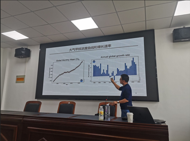 在题为“气候变化与甲烷收支”的讲座上,彭老师先阐述了自己科学问题的发现:甲烷是一种重要的温室气体。自工业革命以来,大气中的甲烷浓度增加了2倍。值得注意的是,近十五年的大气甲烷浓度加速增长,2020年达到了1984年以来有站点观测记录以来的最大值。因此,如何解析大气甲烷浓度近期增长加速的机制,成为国际全球气候变化研究的重要难题。