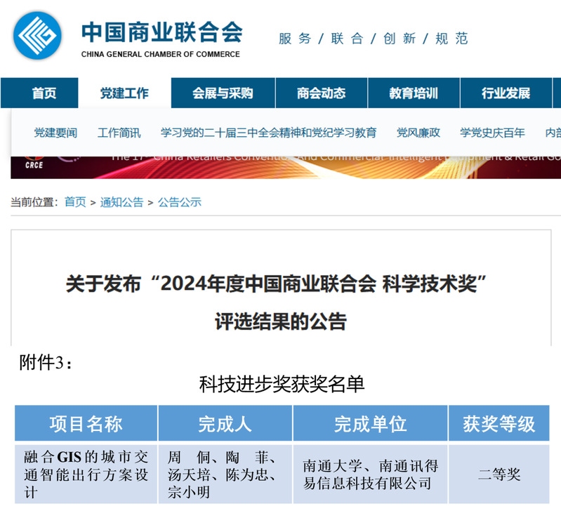 近日,“2024年度中国商业联合会科学技术奖”评审结果公布,beat365官网成果“融合GIS的城市交通智能出行方案设计”荣获科技进步奖二等奖。“中国商业联合会科学技术奖”是经国家科技部、国家科学技术奖励工作办公室批准设立的权威奖项,具备提名、推荐国家科学技术奖资格。奖项旨在表彰在全国商业行业的科学研究、技术创新、成果推广以及高新技术产业化等方面做出卓越贡献的单位和个人。