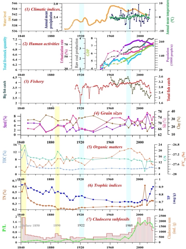 本研究以枝角类为研究对象,采用RDA(冗余分析)和GAM(广义加性模型)等定量方法,对呼伦湖人类活动、气候变化、渔业、营养动态、有机质和粒度等参数进行系统分析,评估人类活动、气候与环境变化对呼伦湖生态系统的影响。研究结果表明,呼伦湖生态系统在过去百年尺度上的演变过程是由人类活动、气候变化和湖泊环境等多种因素的协同作用所驱动。过去170年以来,呼伦湖内部因素(沉积环境、渔类捕获量、湖水水位、有机质和营养盐)以及周边流域的外部因素(人口、城市化率和畜牧业)是驱动呼伦湖枝角类结构变化的关键因素。尤其是自1980年以来,原本占主导地位的枝角类沿岸种(Chydorus sphaericus s.l.)逐渐被浮游种(Bosminidae)所取代,同时伴随着物种多样性的下降,这与湖泊富营养化和污染过程相吻合。枝角类群落动态变化过程表明,由于渔业捕捞量下降、牲畜数量增加、人口增长、城市化率上升以及湖泊水位下降等因素的持续协同作用,呼伦湖生态系统自2000年左右开始面临失衡的威胁。