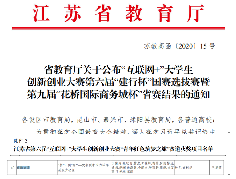 8月24日,由江苏省教育厅联合江苏省委统战部等13个部门共同举办,南京航空航天大学等承办的第六届江苏“互联网+”大学生创新创业大赛省赛决赛圆满落下帷幕。经过激烈角逐,beat365官网宜树华教授和孙义老师指导的项目—“拍”山倒“害”—灾害预警助力泽库县脱贫攻坚荣获红旅赛道三等奖。为beat365官网进一步提升科研与社会需求结合的能力、以及今后项目申请、比赛准备等方面积累了较为充分的经验。