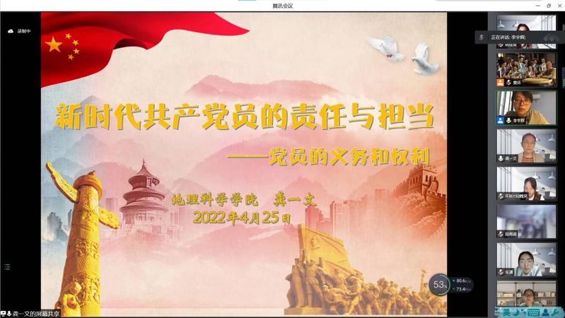 龚一文以习近平总书记在庆祝中国共产党成立100周年大会对青年大学生的殷切希望引入,从党员的基本条件、党员的八项义务、党员的八项权利、义务与权利的辩证关系四个部分展开讲座。龚一文围绕党章,从“党员的义务和权利是什么?”“为什么要规定义务和权利?”两个问题切入,系统阐述了党员的义务与权利的基本定义,强调了党员义务的绝对性和党员权利的相对性。她结合实际,讲述了党员的基本条件,并以习近平总书记所说的“鱼和熊掌不可兼得,当官发财两条道”为例,重点强调了党员不得谋求任何私利和特权。龚一文着重介绍了党员的八项义务与八项权利,并指出党员要在深入学习中、深化认识中、刻苦奋斗中履行党员义务。在义务与权利的辩证关系方面,龚一文阐述了党员义务、权利的特点,分别是党性原则、平等性原则、统一性原则和严肃性原则,深度剖析了义务与权利的辩证关系,强调党员要学用结合,知行合一,切实履行义务,正确行使权利。在讲座的最后,龚一文围绕党章,分别阐述在党章中出现的9次有关于党员义务和党员权利的相关内容,强调自觉履行党员义务、充分行使党员权利的重要性,勉励大家要胸怀远大理想,时刻感知祖国的心跳和脉搏,倾听祖国的呼唤与期许,自觉扛起时代赋予的责任与担当!