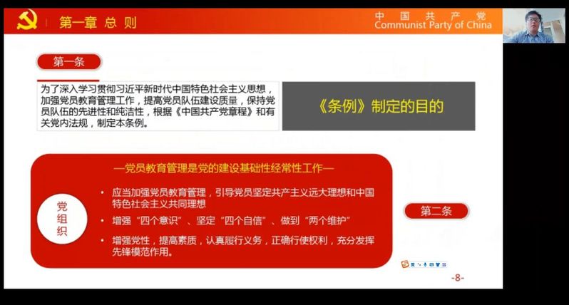 本次讲座旨在向全体参训学员介绍《中国共产党党员教育管理工作条例》,并帮助学员理解学习。通过对《条例》进行详细解读,使学员对如何加强党员教育管理工作有初步了解,有助于提升今后党员队伍质量,时刻保持入党的纯洁性和先进性。