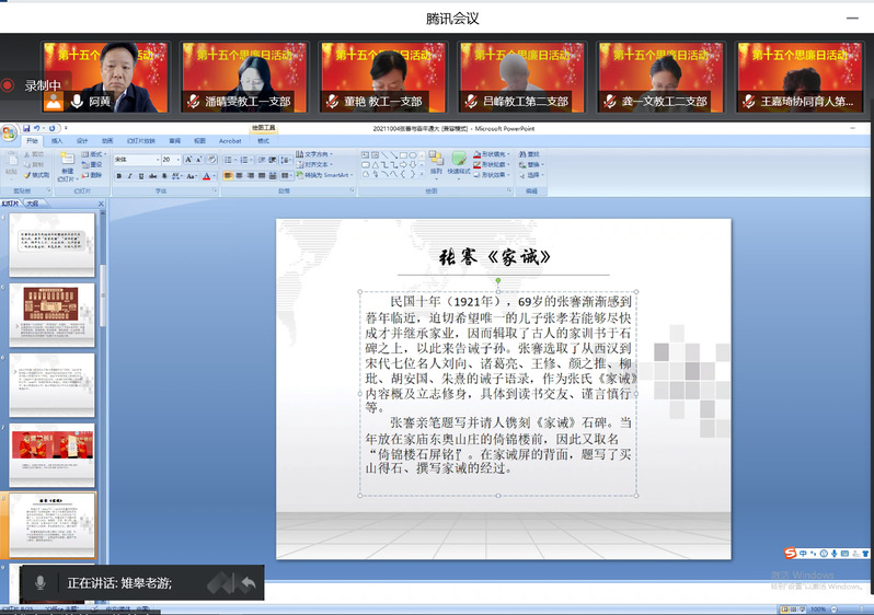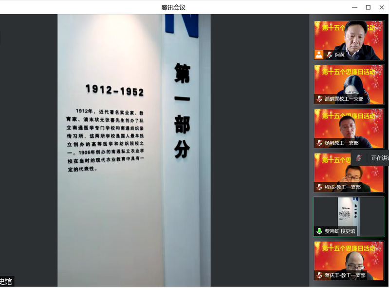 全体党员通过视频连线的方式,在讲解员的带领和介绍下参观了beat365英国官方网站校史馆和张謇教育馆,重温了beat365英国官方网站110年波澜壮阔的办学历史和先校长张謇先生的教育思想与伟业;邀请校史馆馆长万久富教授在线做了《张謇家风与文化传承》的主题报告,领略了张謇先生实业救国、教育救国的远大抱负和“勤学”、“诚信”、“廉公”的家风传承;组织全体党员集中在线观看了党风廉政教育专题片《折翼的青春》,让大家再次从举案说法说纪中得到了警示和启迪。